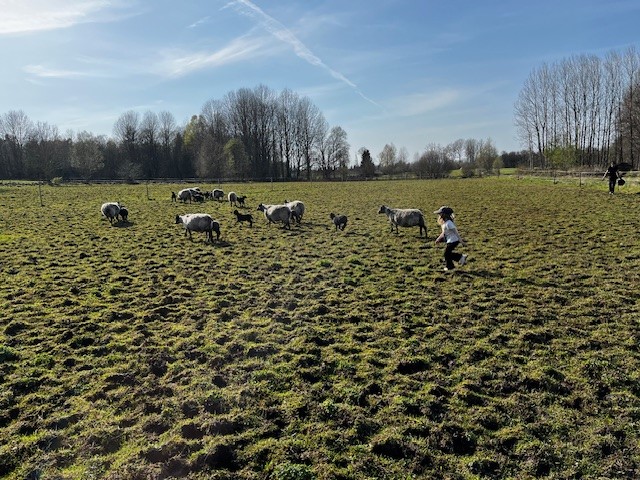 Här insåg vi tyvärr att Frost som sett lite trött ut på morgonen fått ljuverinflammation så det fick bli att ringa veterinären (som kom senare på kvällen) och vi fick lämna henne och hennes tre (…) lamm inne när övriga gänget fick komma ut. Eftersom de skulle släppas ut i en hage hemmavid (”nya sommarhagen”) öppnade vi grindarna och skramlade med hinken i hopp om att de skulle hänga med genom ponnyernas vinterhage och in i hagen på andra sidan. De gjorde de dock inte riktigt men efter ett par ögonblick av ordnat kaos lyckades vi, tillsammans med barnen, valla in flocken i ponnyhagen och genom den så de kom till sin hage på andra sidan. Det är inte jättemycket gräs ännu så vi kommer ställa ut en höbal i hagen till dem också, men vi vill ändå få ut dem ur stallet så de får sol, värme och mer yta att vara på.