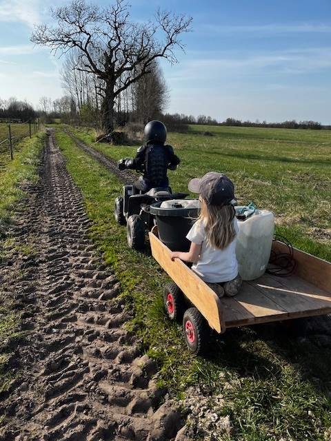 Och innan vi gick ner till kvällens grillmiddag så fick det köras lite vatten till fåren också, de har visserligen en halv sjö i hagen efter vårens alla regnskurar, men Loke ville så gärna köra vatten så det skadar väl inte med en balja också!