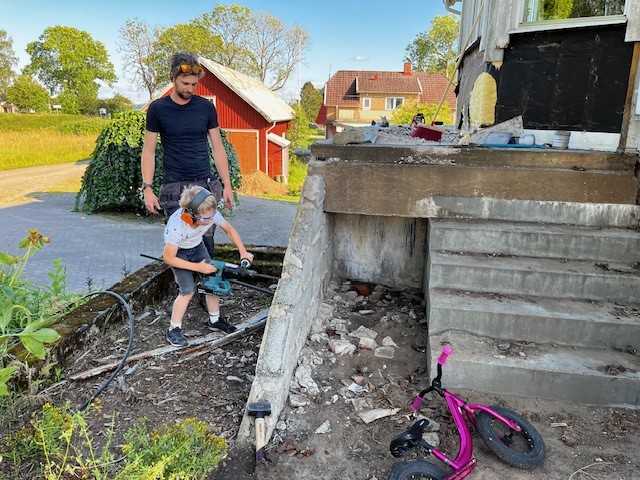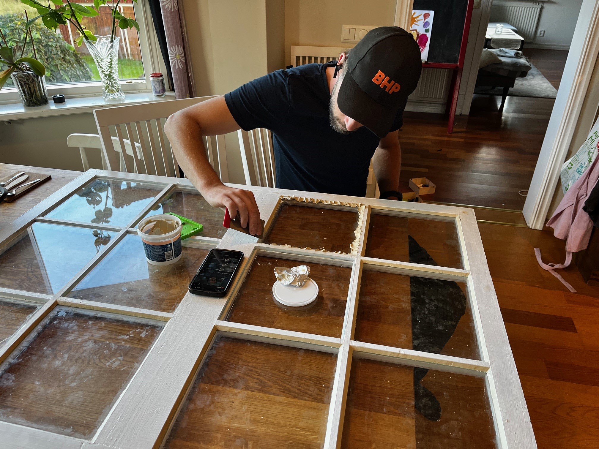 ….började Axel kitta fast glasrutorna i ramen som jag tidigare oljat och målat.