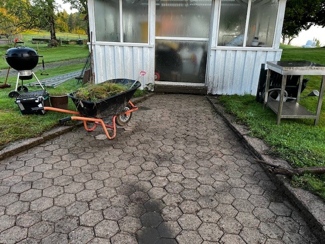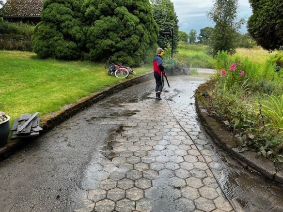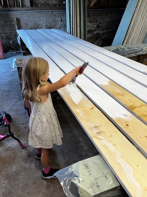 Under lördagen blev det lite brädor målade och vi var hemma och Oma och Farfar och fick några tjocka glasrutor att skära till, till fönstret vi ska sätta in i ladan. 12 rutor fick vi ihop och medan jag och barnen tog ut Domino på en längre ponnyvagnsrunda….
