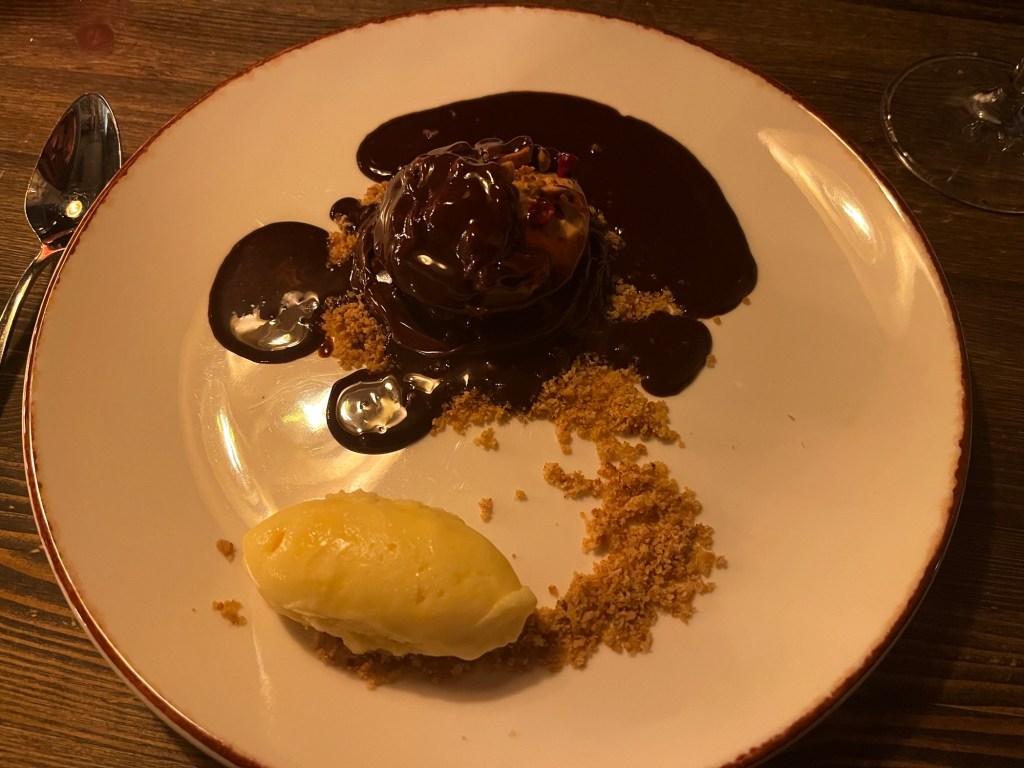 Och till efterrätt chokladbomb med sorbet.
