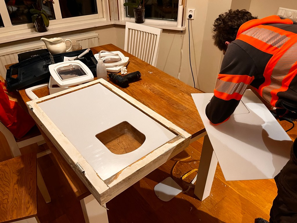 Det börjar närma sig för snickarna att ta sig an fjärde och sista sidan av huset och det kommer innebära att vår ytterdörr byts ut och kattluckan försvinner. Vi har inga ambitioner att sätta in en ny kattlucka i den nya ytterdörren men vi vill att våra katter ska fortsätta kunna gå in och ut som dem vill. Därför behövdes ju en ny passage in för dem och det fixade vi igår!