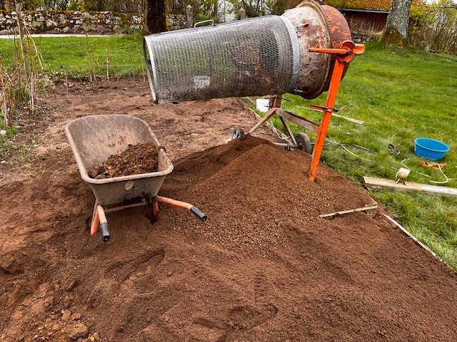 Vi har också satt igång projekt grönsakslandet och för att bli av med lite ogräs håller vi på att ”sortera” hela jordinnehållet i vår (av Farfar) modifierade betongblandare. Man kastar en skopa jord med ogräsrötter i gallerdelen och jorden silas ut och ogräsrötterna hamnar i skottkärran. Ganska fiffigt ändå och jorden blir väldigt luftig och fin samtidigt.