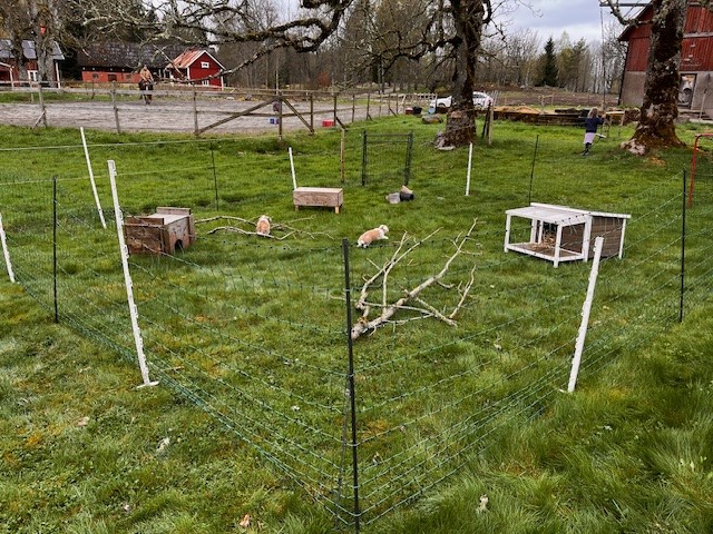 Kaninerna fick en ny, större hage. Det dög ju inte med den hagen jag byggde vid lekstugan för där tog väl maten slut för fort och trots hö så var kanske lockelsen av gräset på andra sidan för stor för de grävde sig ut. Medan vi var i Slovenien blev de därför förpassade till den lilla buren som mormor kunde flytta lite varje dag för att ge dem nytt gräs, men det var inte heller bra sa dem, utan de grävde sig ut. Nu testar vi den här varianten, med el på staketet för annars är nog hålen för stora i nätet. I skrivandes stund är det ju torsdag och de har inte smitit än i alla fall!