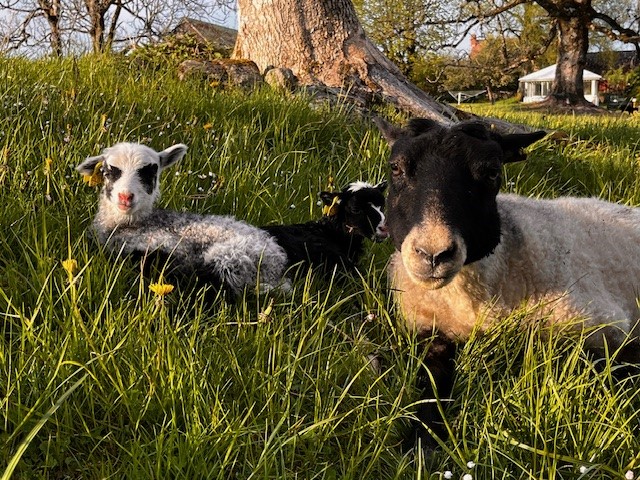 De nya lammen fick vara kvar inne under tisdagen och sen på onsdag eftermiddag när Axel kommit hem så tog vi ut dem tillsammans. Härligt att få komma ut i solen och så fick mamma Frost äta gott med gräs. Båda hennes lamm är tackor, och det är ju väldigt lockande att behålla den ljusa och se vad det blir av den, även om det inte är helt ”korrekt” för rasen att se ut så. Vi får se hur den utvecklas helt enkelt!