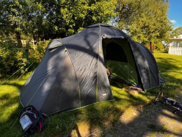 Jag jobbar ännu denna vecka, men Axel och barnen har semester så igår åkte de en sväng till Partille och inhandlade grejer till vår kommande semestervecka i Nederländerna. Vi ska ju tälta är tanken, så tält stod på inköpslistan bland annat. När jag kom hem från jobbet var de i full färd med att sätta upp tältet.