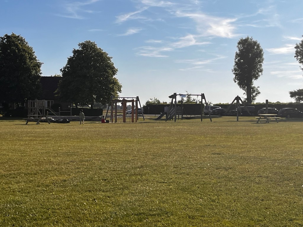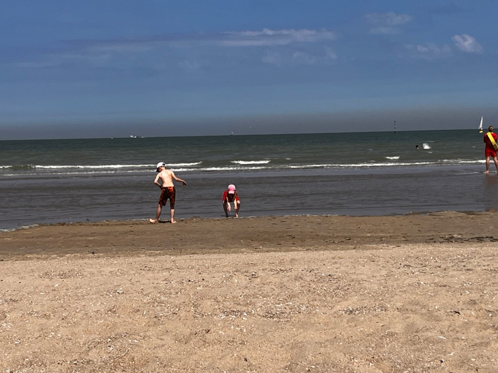 Det var inte mycket folk på stranden som ni ser, och värmen kunde vi inte heller klaga på! När vi var nöjda vid stranden handlade vi på vägen tillbaka till campingen och vid tältet lekte barnen på lekplatsen medan vi fixade klart vårt boende och lagade hamburgare till kvällens middag.