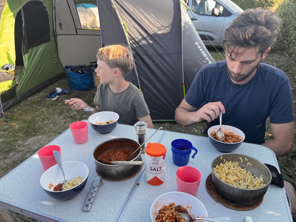 Så dit fick vi såklart! Tidvattnet var på väg ut och det blev en fantastiskt stor strand med pölar och grunt vatten. Barnen plaskade och lekte med strandleksakerna vi hade med oss, och Axel letade ammoniter. Hela eftermiddagen/början på kvällen var vi här men till sist blev vi hungriga och vi gick tillbaka till tältet och lagade makaroner och köttfärssås.