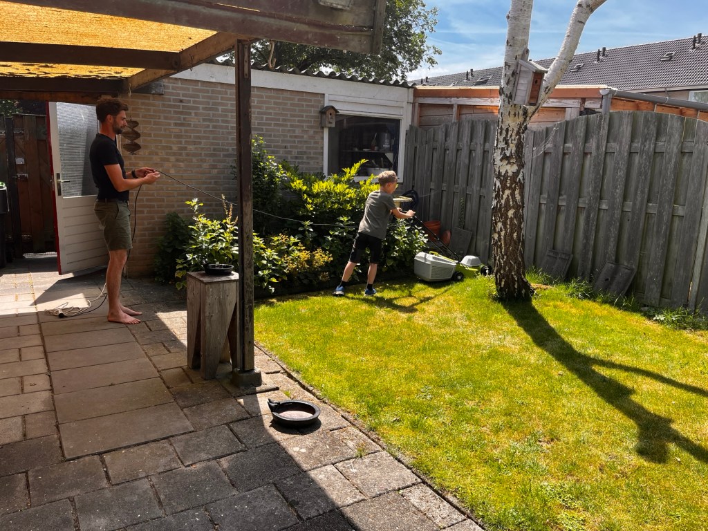 Så kom dagen då det var dags att vända bilen lite hemåt. Vi hade förberett så mycket vi kunde under kvällen, med packning och frukost, så att vi på lördag morgon enbart kunde riva tältet och åka, i stort sett. Vi åt frukost i bilen och när den var uppäten roade sig barnen med sina nyinköpta leksaker nästan hela vägen till Harderwijk. I Harderwijk åt vi lunch med Oma Oma, träffade moster Marita och även kusin Bram kom förbi. Loke och Nora hjälpte också till lite i trädgården!