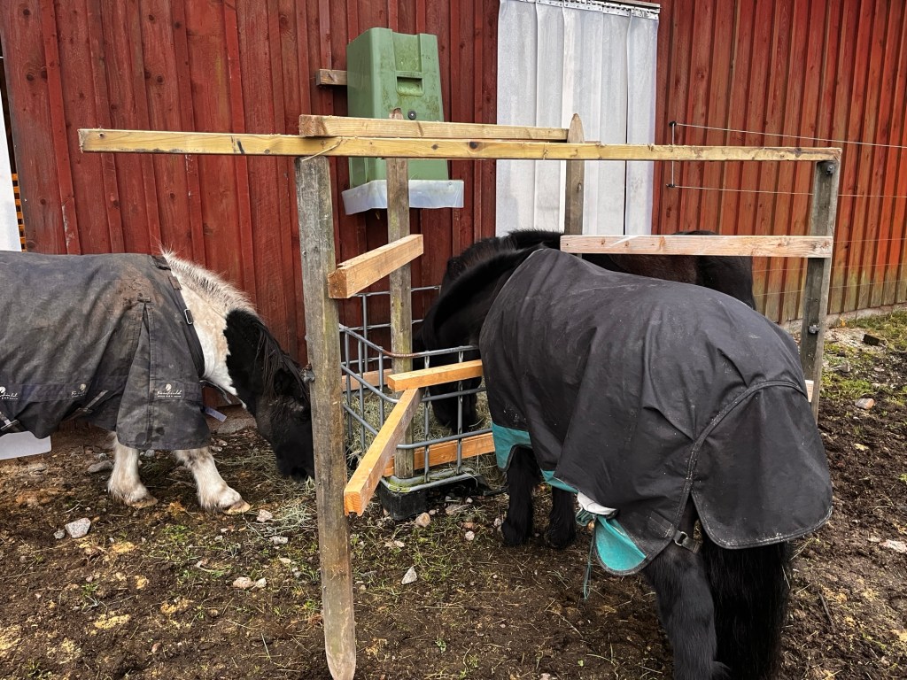 Så det har vi nu byggt en ”borg” så de kan äta utan att jaga bort varandra, och det funkar ganska bra. Assim surar lite med huvudet och småbits, men de andra kommer ändå åt att äta. Så detta verkar lovande ändå, jag tänker att det blir bättre när de vant sig lite. Och jag fodrar ju fortfarande ”manuellt” två gånger per dag och kan då ge dem var sin hö-hög om det behövs.