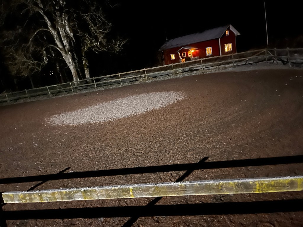 På söndag förmiddag åkte vi en sväng till Alingsås och handlade vinterskor till Nora och salt till ridbanan, och när vi kom hem gjorde vi ett försök att salta ridbanan. Spridaren spred saltet över lite väl stora områden, så effekten blev kanske inte riktigt lika bra som det hade kunnat bli, men klart bättre i alla fall!