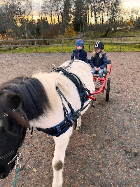 Han har också fått lite mer dragträning och faktiskt fått dra vagnen lite på ridbanan medan jag gått bredvid honom och det har också gått bra. Nora har också suttit på honom ett varv på ridbanan i skritt vilket också gick bra. Han har en tendens till att sparka bakut i ”protest” vilket jag jobbar med att få honom att sluta med. Jag tror att han har lärt sig att man kan sparka bakut och då skrämma den som hanterar honom och då få göra precis vad man vill, men det fungerar ju inte hos mig tyvärr. Så vi jobbar med att han ska förstå vad jag vill, och att det betyder att vi kan ha roligt tillsammans, så mycket beröm och uppmuntran men också en ganska tydlig markering att sparkas, det är faktiskt inte okej. Och det går väldigt bra hittills får jag säga!