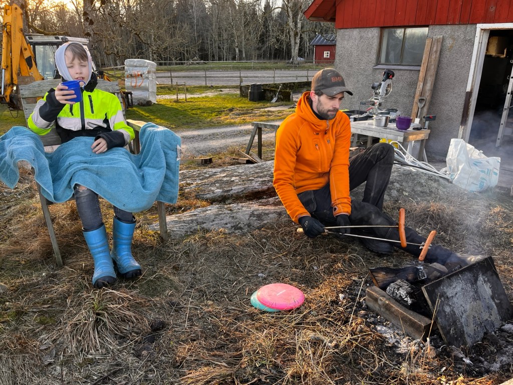 Barnen roade sig på isfläckarna och vi eldade lite pinnar så vi fick en fin glöd till korvarna vi ville grilla till lunch.