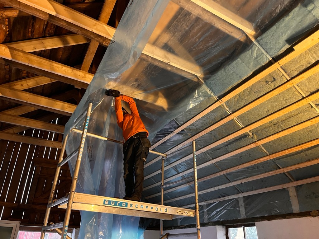 Efter lunch körde vi vidare i verkstan och när vi lämnade det för dagen är det i stort sett redo för att sättas gips på den delen av taket som är närmast stallet. Det ska nämligen upp en rad med dubbelgips där för brandskyddets skull, på resten av taket ska det ”bara” sitta en annan slags skiva.