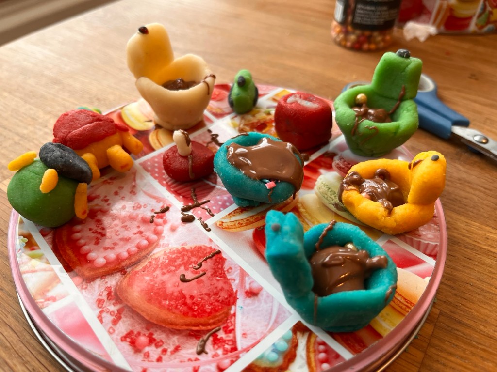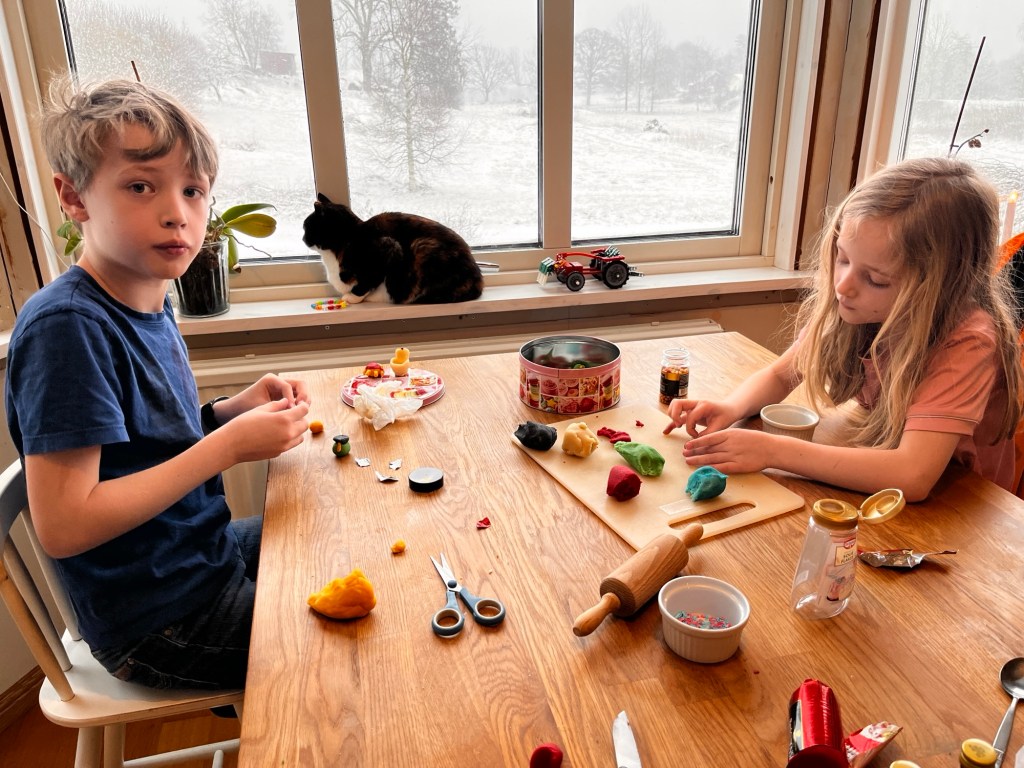 Det blir inte mycket gjort utomhus dess blåsiga och snöiga dagar, desto mer inomhus. Vi fick inspiration från Peter och hans barns marsipanfigurer så det roade vi oss med under ett par snöiga timmar.