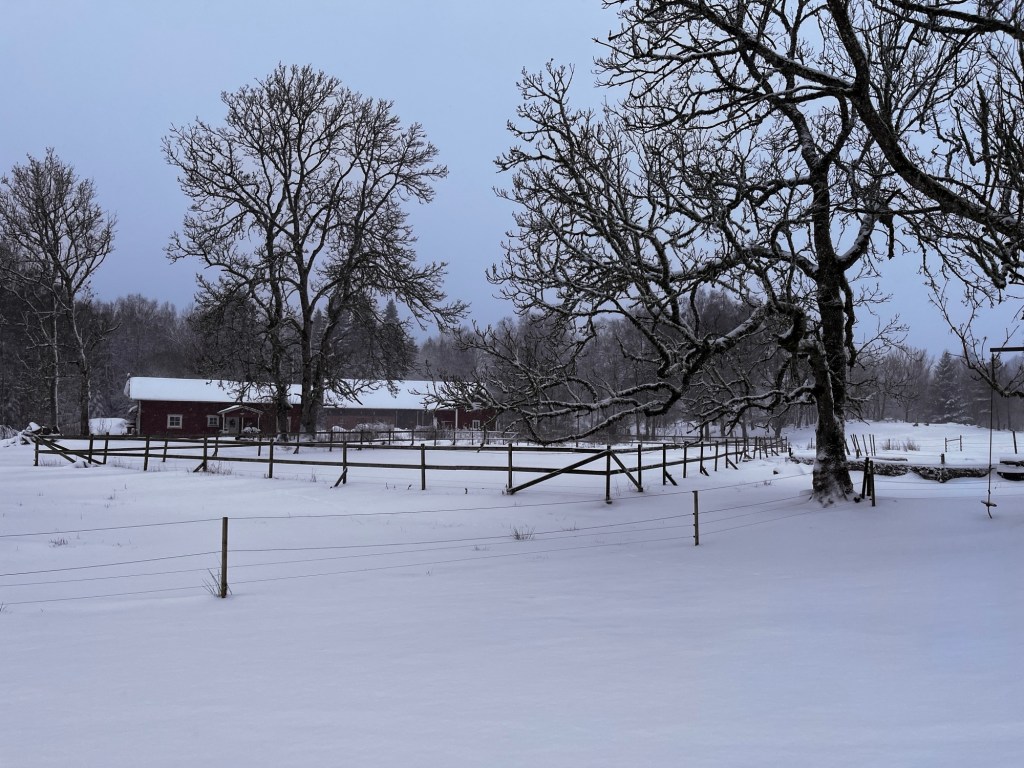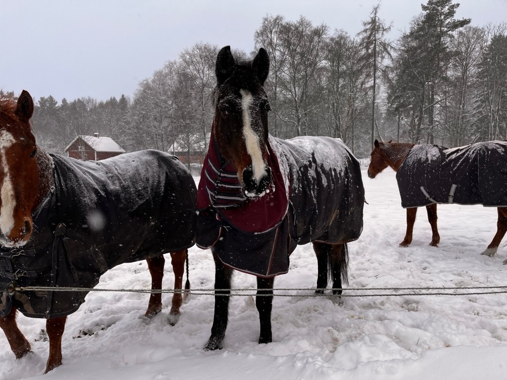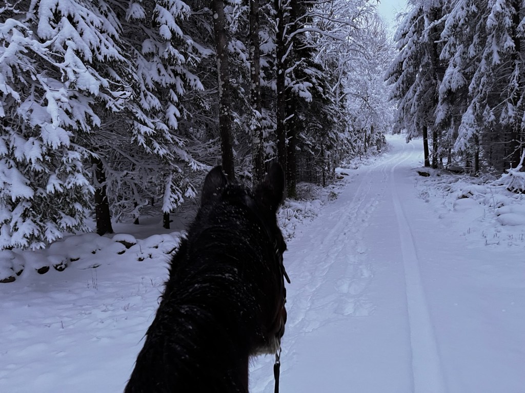 Idag, måndag, inleddes dagen på hästryggen och jag red ut en liten runda i snön. Härligt! Inne i skogen har det inte blåst lika mycket så där ligger snön kvar på träden, vackert!