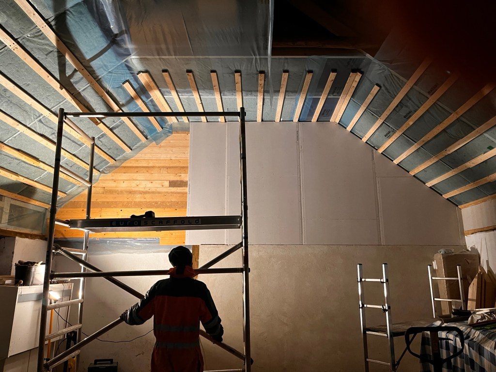 Jag och Axel la ett par timmar i verkstaden också och har nu fått upp lite gips på väggen. Så lite framsteg där också!