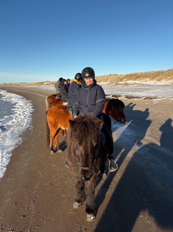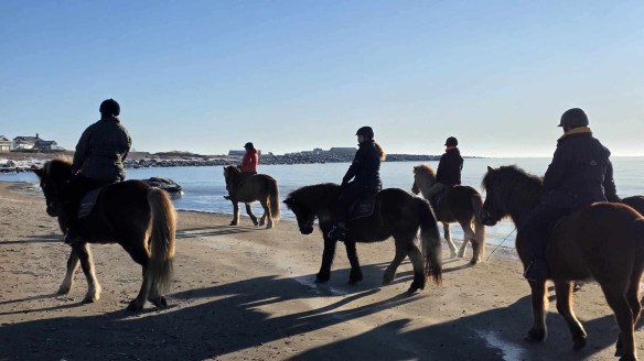 På mitt jobb finns det möjlighet att söka pengar till att ordna en aktivitet utanför arbetstid för fler medarbetare, till exempel åka till Prison Island, gå en matlagningskurs etc. Här i januari var det en person som sökte pengar för att rida på islandshästar på stranden i Falkenberg och fick detta beviljat för tio personer, så jag bestämde mig för att hänga på! I går, söndag, var det dags och jag dividerade med mig själv hela vägen dit hur mycket kläder jag skulle ta på mig för att inte frysa, men jag ville samtidigt verkligen inte vara en orörlig Michelin gubbe. När jag körde förbi Kungsbacka på söndagsmorgonen stod termometern på -17 grader och jag bestämde mig att det fick ju bli termobyxorna på. Men så kom solen upp och när jag kom fram till stallet i Olofsbo var det ”bara” 11 minusgrader och jag tänkte att det kommer nog räcka med mitt underställ och vinterridbyxor (och tröjor, väst, jacka, halsduk etc). Så det fick bli så och det blev faktiskt jättebra. Jag ångrade mig nästan medan vi stod och väntade på att vi skulle få våra hästar tilldelade, men så fort vi kom upp i sadlarna och red iväg värmde solen på fint och vi höll igång bra så jag frös inte alls faktiskt.