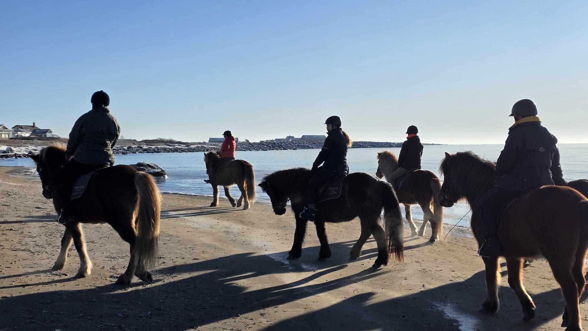 Vi började inne i ridhuset och spände sadelgjordar och justerade stigläder och sen red vi iväg, eftersom alla vi tio var vana ryttare. Ritten gick över ungefär nio kilometer och vi var ute i ungefär en och en halv timme, kanske lite mer. Vi red genom ett stugområde och ner till stranden, fantastiskt vackert!