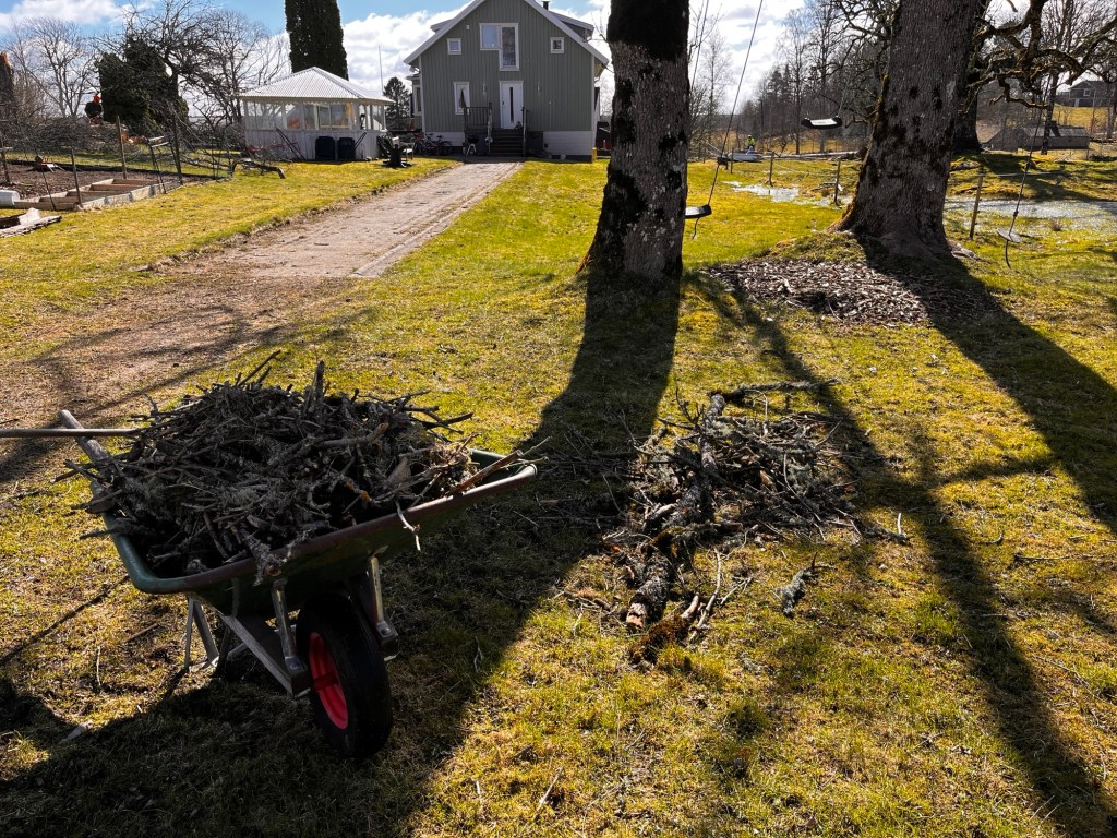 Ulf har börjat ta hand om stora trädet i trädgården, och jag och barnen har krattat ihop en del pinnar i andra änden av trädgården.