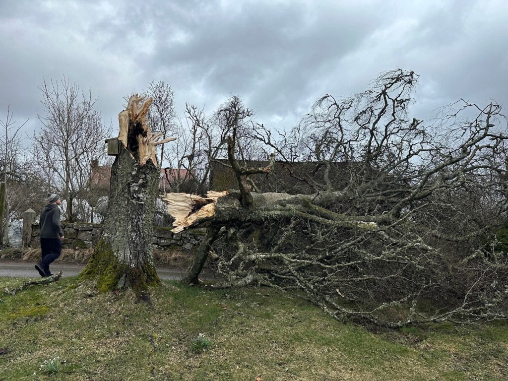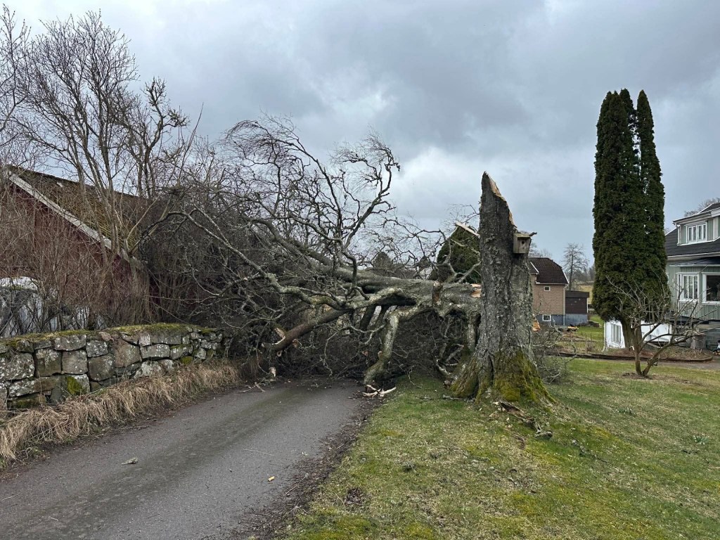 I söndags var det dags för storm på gården, i vanlig ordning är jag inte så orolig inför dessa varningar för det brukar aldrig bli så illa hos oss som det varnar för. Vi har generellt inte så mycket lösa grejer som ligger utspridda men under förmiddagen kikade vi ändå lite kort för att se om nåt behövde läggas undan inför stormen, men det såg okej ut. Under förmiddagen var det ganska lugnt men efter lunch drog det igång lite mer och blåste på, men inga konstigheter. Under eftermiddagen ökade dock stormen i styrka. Jag och barnen satt i soffan och spelade kort och då såg jag plötsligt hur den stora björken i trädgården la sig över vägen och på grannens jordkällar-tak.