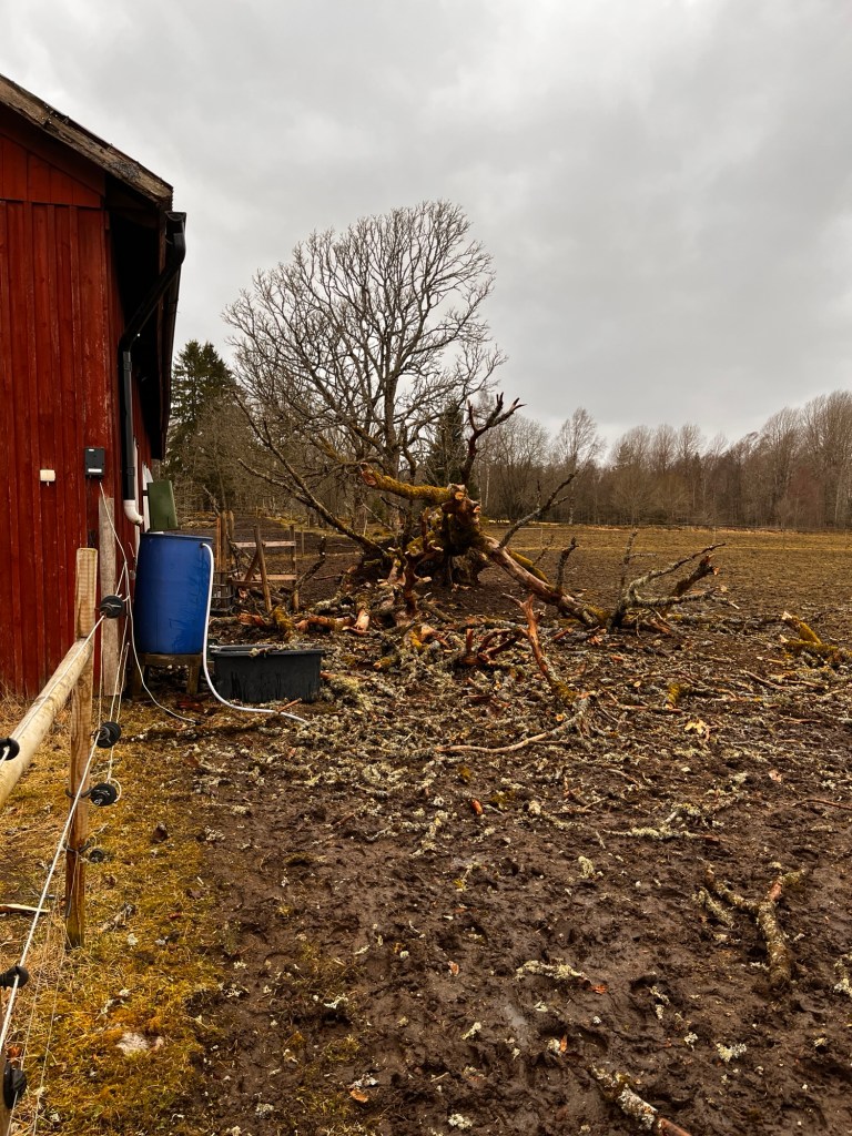 Under resten av eftermiddagen jobbade Axel, Nils och Ulf med att få bort björken från vägen, inget litet arbete mitt i stormen. Väldigt tacksamt med all hjälp! Jag och barnen höll oss inne och sprang mellan fönstren för att se fler träd i hagarna runt oss trilla. Det trillade två träd in över hästarnas vinterhage, den ena blockerade öppningen mellan lilla delen och stora delen av vinterhagen, så hästarna kunde inte ta sig dit. Och två stora träd i hagen utanför huset såg vi också falla.