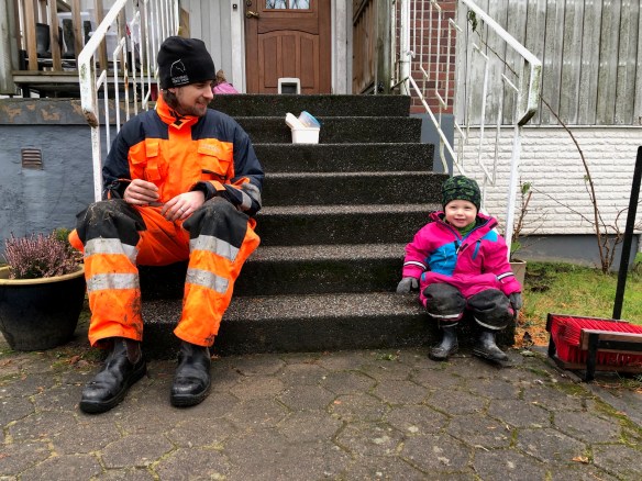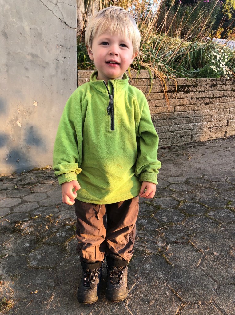När pannkakorna var klara fick vi på oss kläder och vi avklarade resten av morgonbestyren och tog oss ut till bilen för att åka till förskolan. Det är kyliga dagar nu och efter lite ”shopping” bland arvegodset i garderoben i helgen hade vi med oss fodrade stövlar och byxor till förskolan, och Loke har fått på sig vinterkängorna.