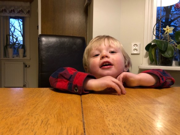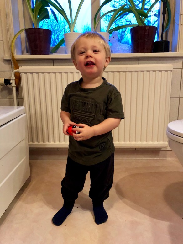 Idag fyller goa, glada underbara Loke hela TVÅ år. Tänk vad tiden går ändå, och vad roligt det är att följa denna lilla killes utveckling. Oftast i alla fall, han verkar äntligen ha gått ur en ganska långdragen ”dålig” period där han har varit ganska arg, frustrerad, mammig, klängig och allmänt jobbig faktiskt. Och den som känner Loke till vardags vet ju att han alltid har varit en väldigt glad och obekymrad kille, så detta har varit en ganska påfrestande period. För båda hans föräldrar men kanske mest för mamman som dels är gravid men som också blivit mest ”utsatt”. Det har gått ganska bra när Loke har varit antingen med mamma eller pappa, men när vi har varit tillsammans alla tre är det bara jag som har ”dugit” (och tro då inte att han varit nöjd och glad när han varit hos mig heller). Loke har typ börjat gallskrika/gråta så fort Axel gjort någon ansats till att ”ta Loke ifrån sin mamma” och nåde den som kommer på förslaget att pappa ska putta gungan, eller vagnen, det ska mamma göra. Och hon får inte putta fram på gungan, eller stå lite vid sidan av utan hon måste putta bak!! Det har också blivit utbrott när barnet inte fått saft, eller utbrott när barnet HAR fått saft. Eller när såsen hamnade på riset, eller på tallriken över huvud taget. Ja ni hänger med va? Men det är ju bara att ta de viktigaste striderna och ignorera resten, och upprepa ”det är en fas, det går över” flera gånger om dagen. Eller flera gånger i timmen. Men nu de senaste dagarna känns det nog ändå som att det har vänt lite.