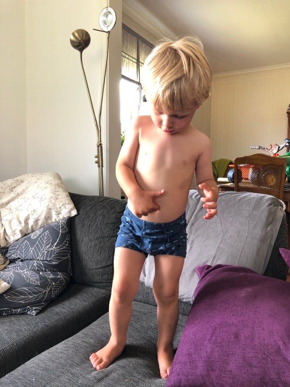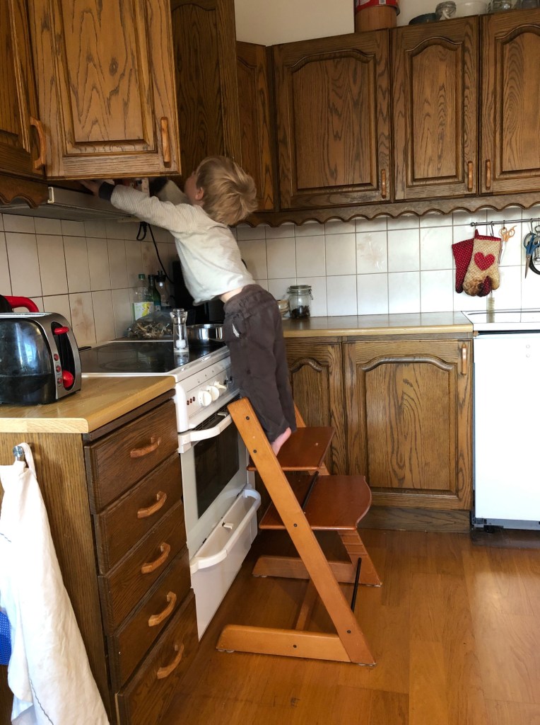 Ja då har veckan då bebisen förhoppningsvis tittar ut inleds. Jag och Loke började dagen med frukost och därefter ville Loke ”koka pannkakor”. Viktigt med salt och peppar!