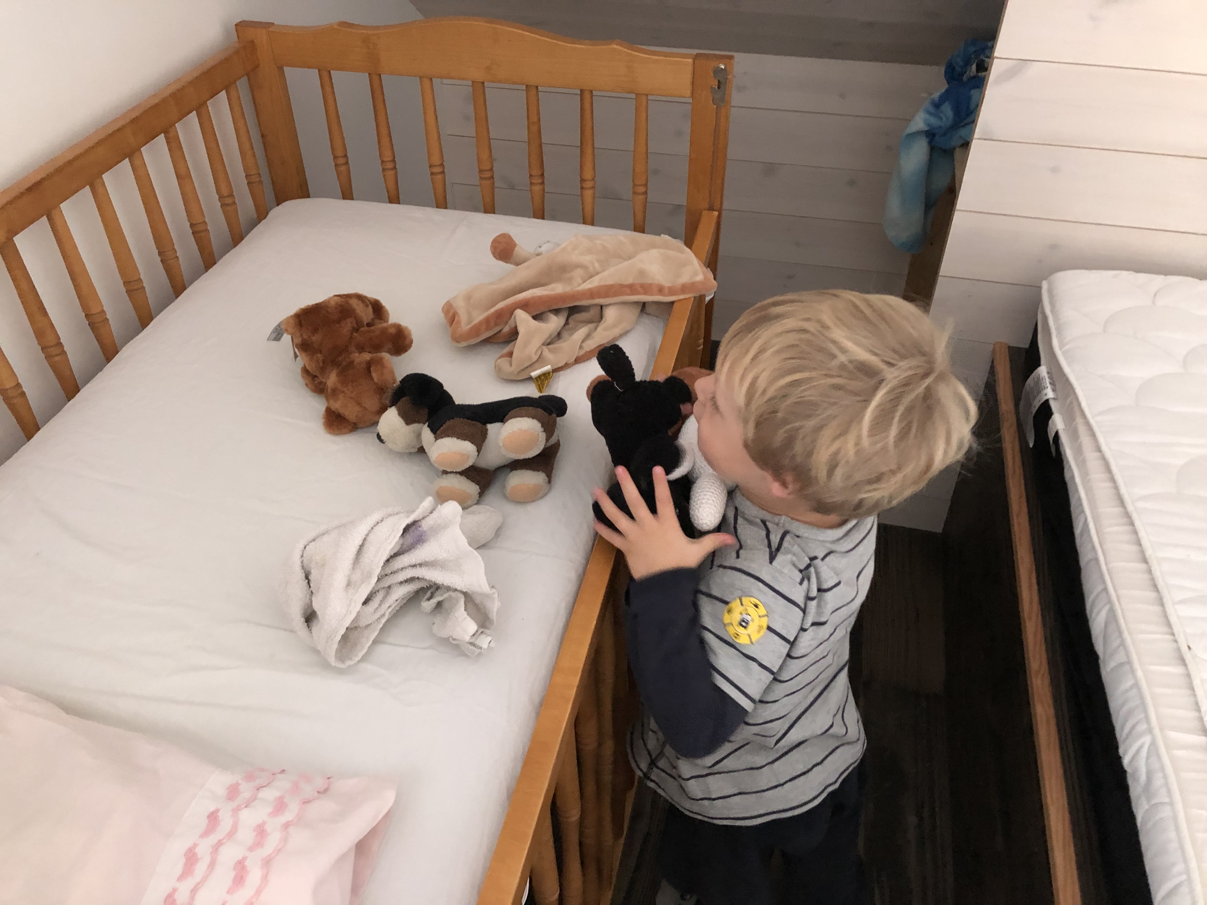 När Loke vaknat åt vi lite frukt och sen körde vi ett tvättrace på lakan och handdukar. Och bar in bebisens säng i vårt sovrum och bäddade den. Loke hjälpte till och bar in alla gossedjur, förutom Björnen, Lejon och en Kanin.