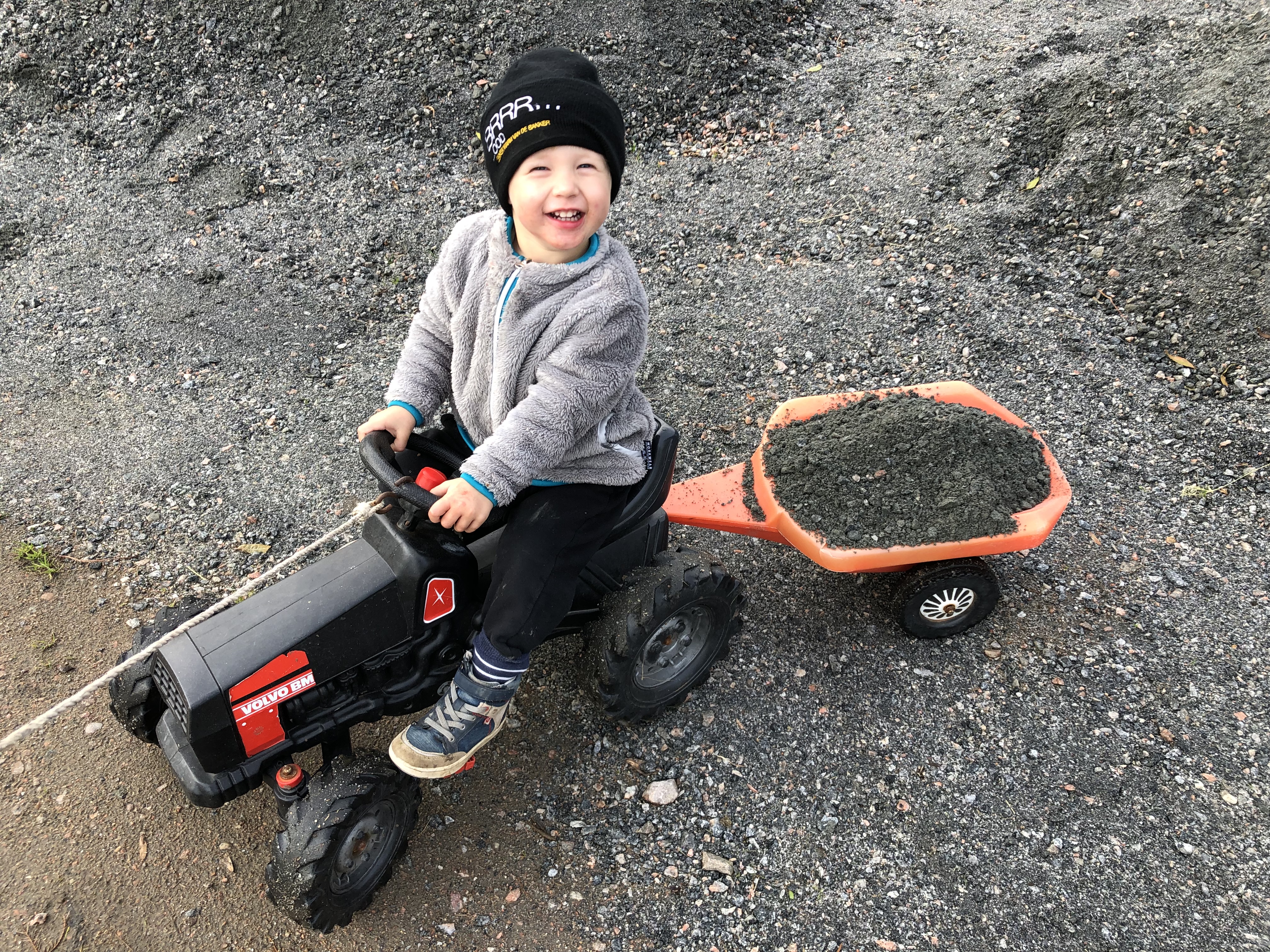 Åka traktor, lasta grus i kärran och tippa den: