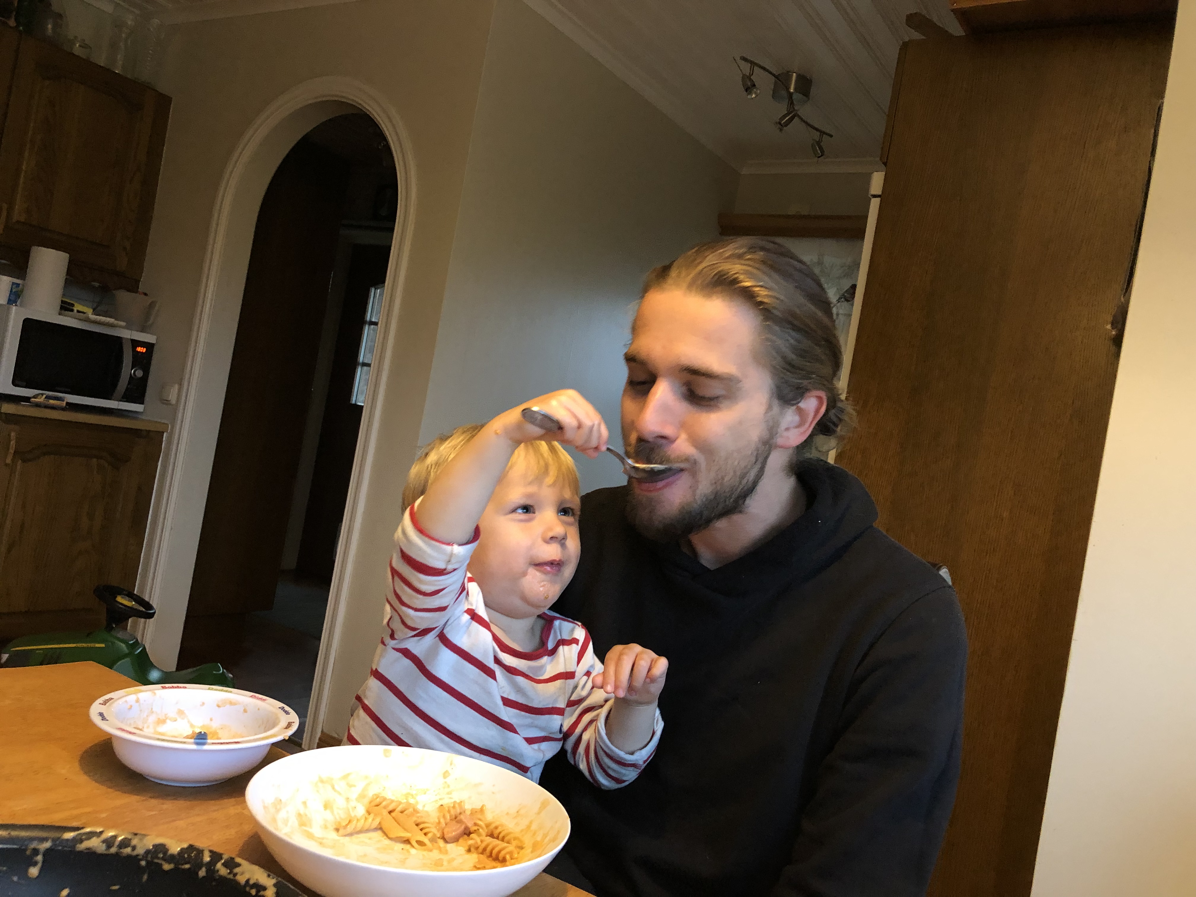 Sen lagade vi mat och Axel kom hem så vi åt tillsammans. Loke tränade på att vara storebror.