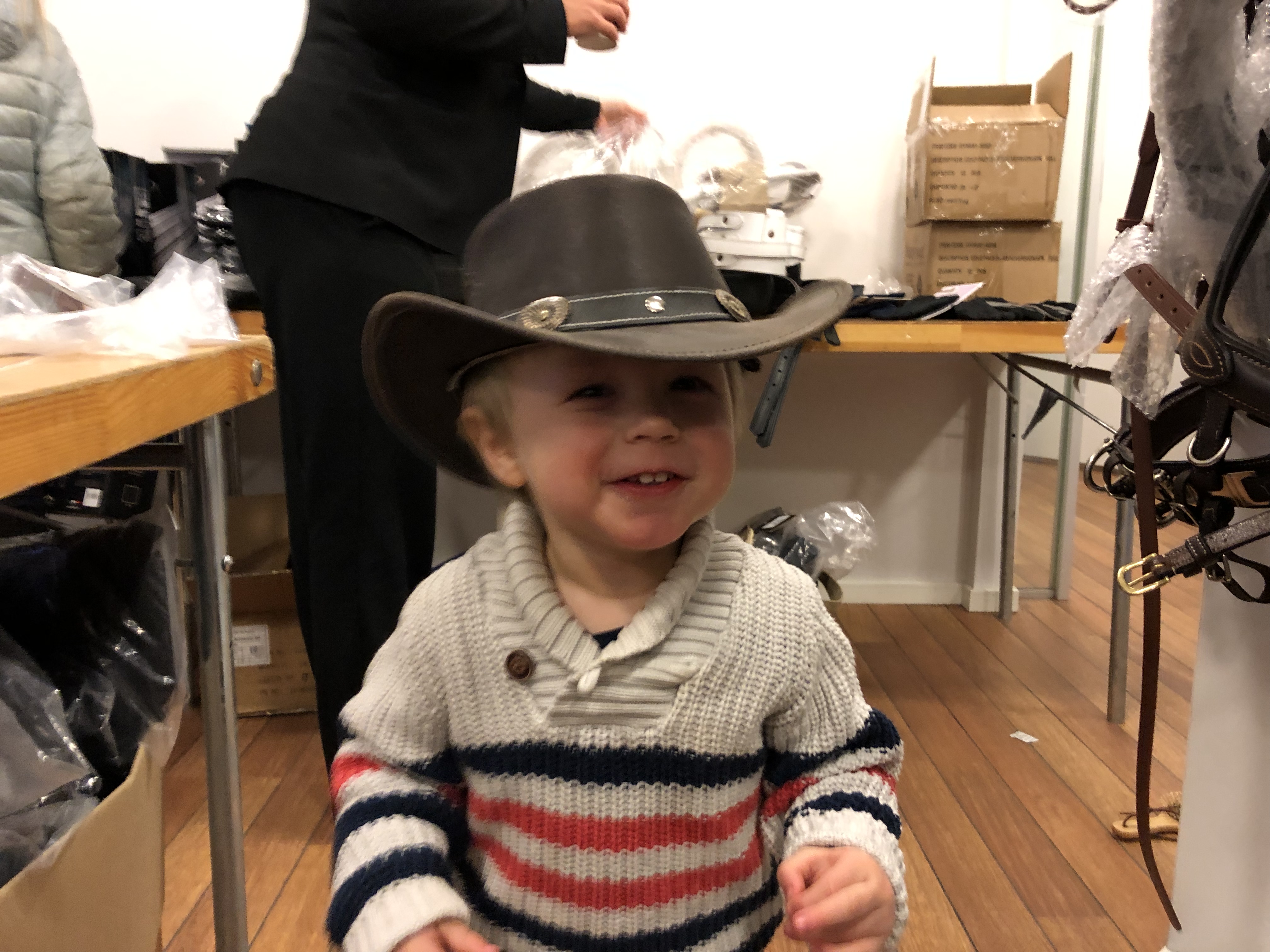 Till sist körde vi vidare till målet för utflykten: Exklusiv förhandstillträde till HorseMeUps utförsäljning som jag blev inbjuden till av Sofia från stallet i Partille. Utförsäljningen börjar först i idag men Sofia jobbar med det här företaget på något vis och fixade en dag för sitt stall och lite annat folk. Fräsigt! Jag hade ju med mig Loke så jag hade inga direkta förhoppningar att göra annat än jaga efter barnet i butiken och hälsa på Sofia och Linda, men han var en pärla faktiskt! Eftersom det var utförsäljning i deras lagerlokaler var det inte så ”prydligt” som i en vanlig butik utan det var lite huller om buller liksom. Perfekt lekstuga helt enkelt! Loke klättrade på högar av (inplastade) täcken, provade borstar på sig själv, smakade på hundgodis, klappade skylthästen, och testade hattar!