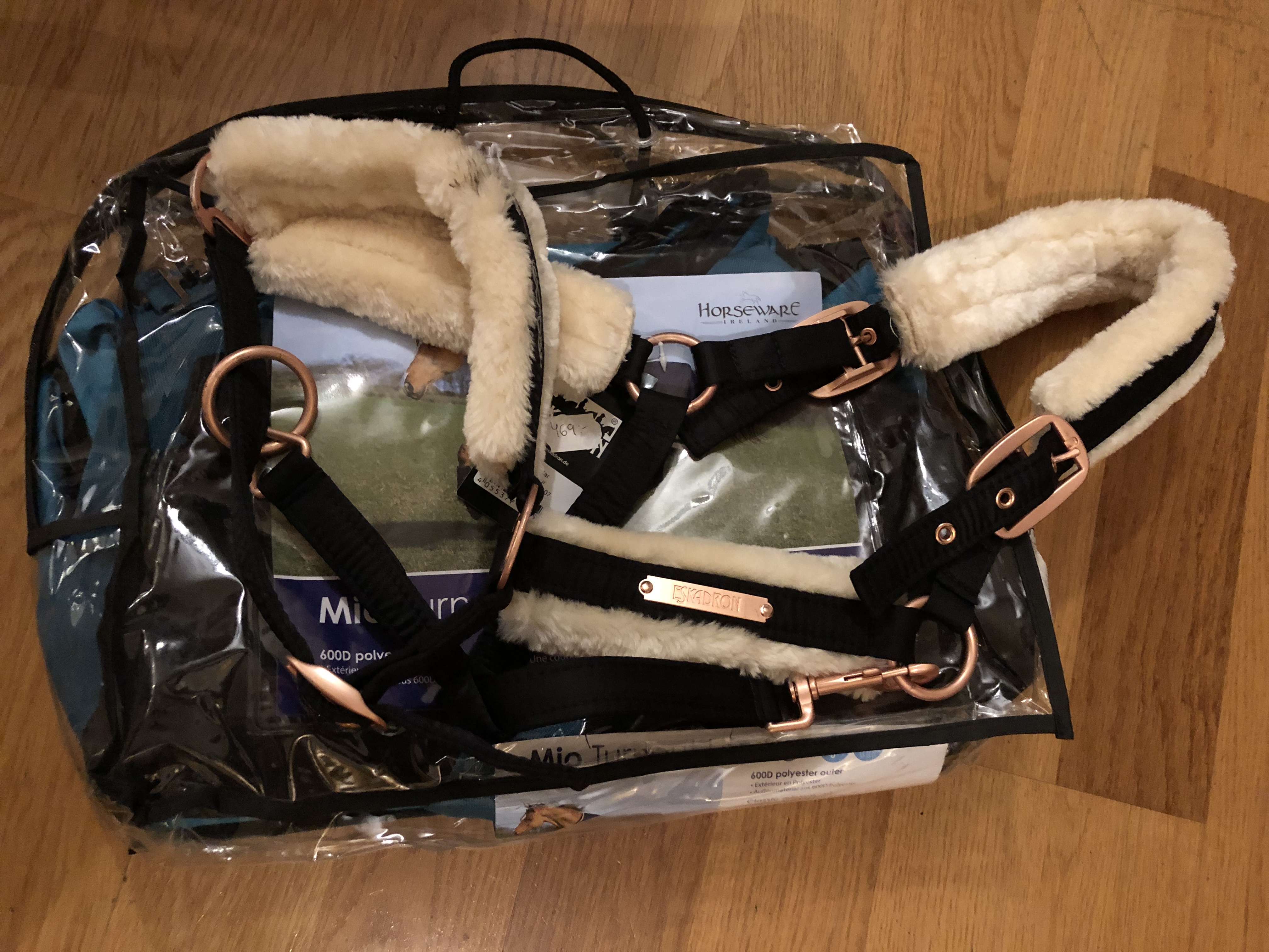 Betalade bara 400kr för båda och det var mindre än vad bara grimman kostade till fullpris (då hade jag iof inte ens tittat på den så på så vid blev det ju dyrare!) Väldigt fluffig och tjusig i alla fall med spännen i rosé-färg, haha. Får vänta tills leran och vinterpälsen försvunnit innan hästen får prova den… Drygt halva priset på täcket var det också och de går ju åt!