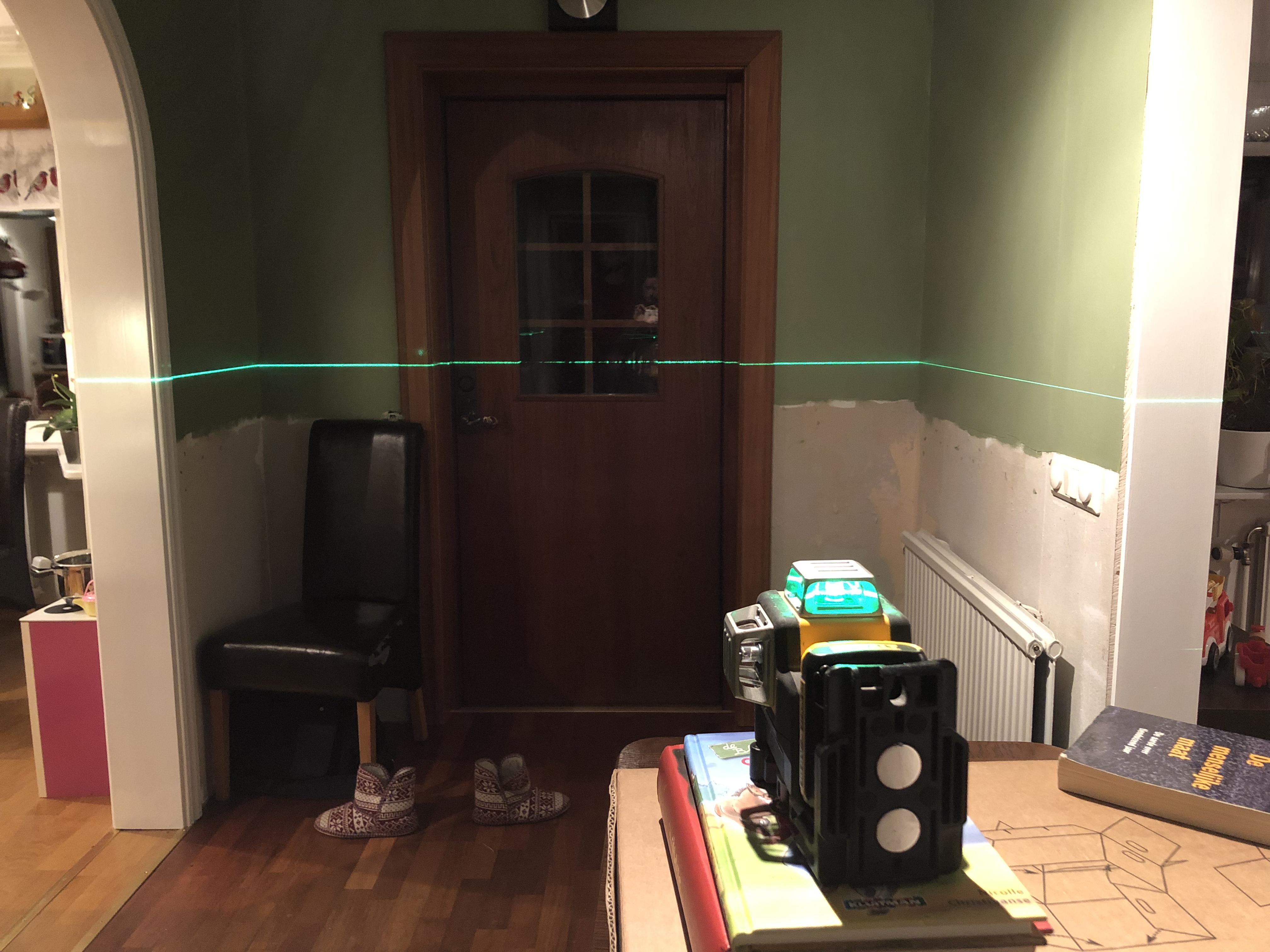 Nu i helgen har vi lånat hem en laser till hallen för att kunna mäta för panelen runt om i rummet. Vi mätte in rätt höjd och ritade sedan av laserns linje överallt så vi får panelen på samma höjd hela vägen runt.