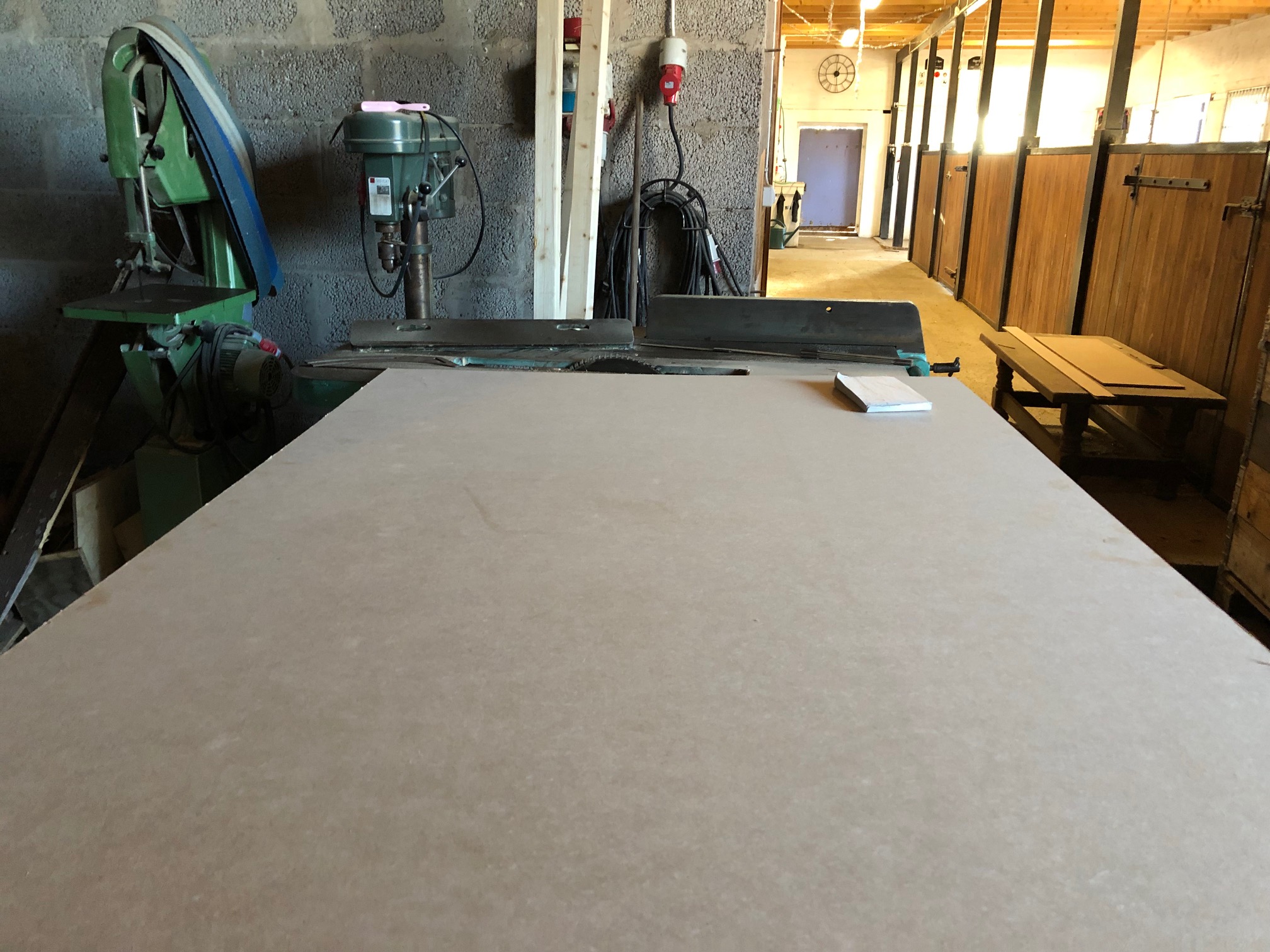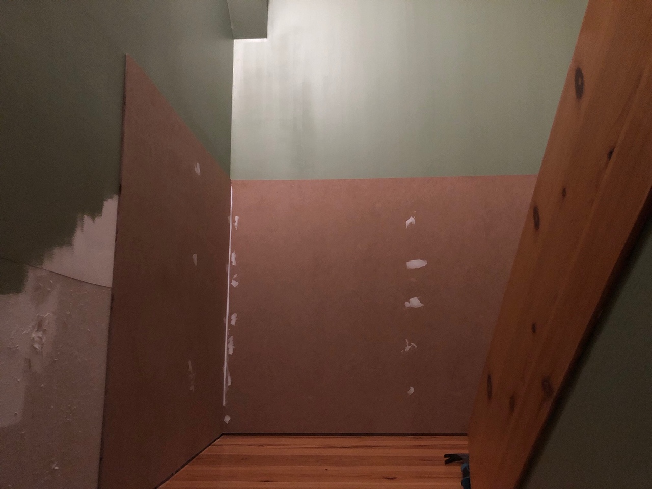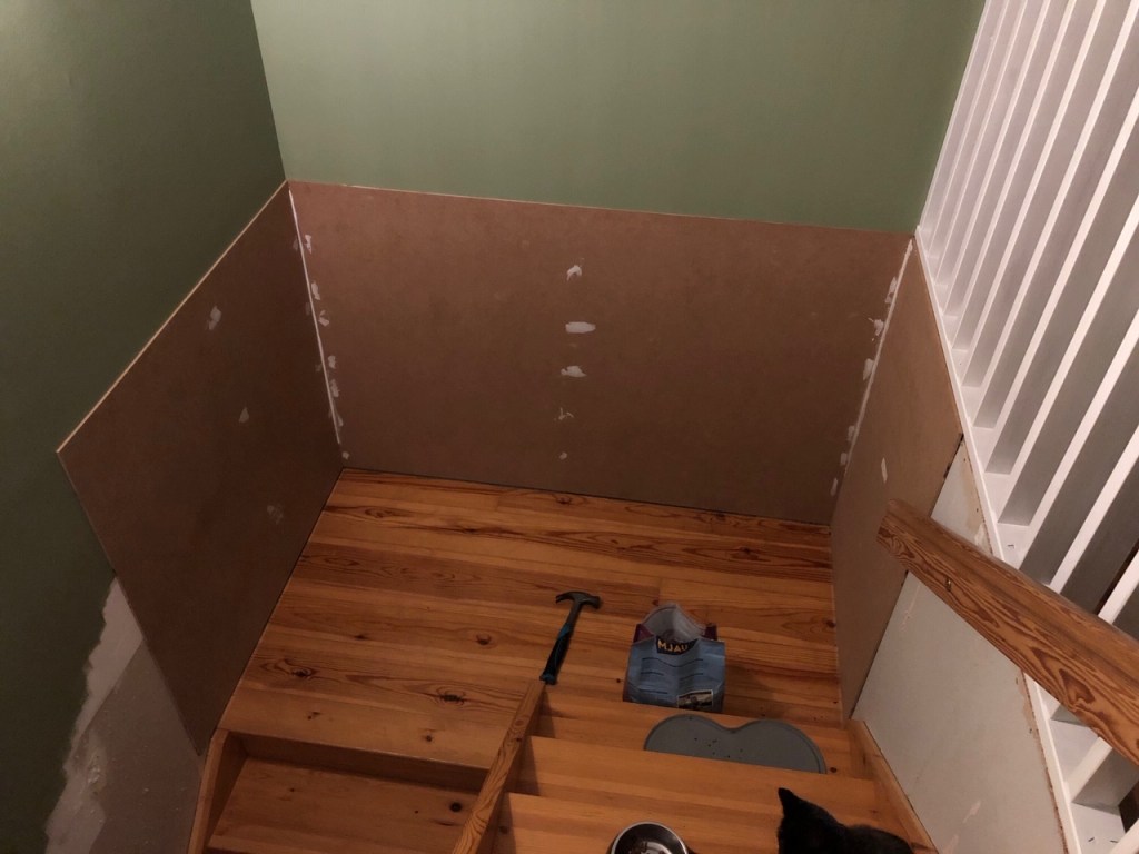 Här ser man panelen ta form! Vi har nu satt denna tunna skiva hela vägen från dörren till källaren och runt fram till trappan (skivan på bilden ovan).