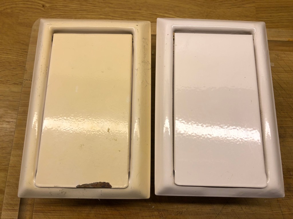 En negativ aspekt på att måla vitt är ju att alla kontakter och lampknappar gärna ser gula ut. Just här är kontakterna helt okej faktiskt, och det gamla telefonuttaget har vi byggt för så det slipper vi se. Lampknapparna är sådär, men de är ju ganska enkla att byta ut om vi stör oss på dem, men sen var det ju den där luckan till centraldammsugaren också. Gul, ful och skadad! Lyckligtvis har Axel sedan tidigare hittat en helt ny lucka ute i verkstan (vad finns inte där ute att hitta…) och se bara, ni måste ändå ana min tillfredsställelse att få byta ut denna!