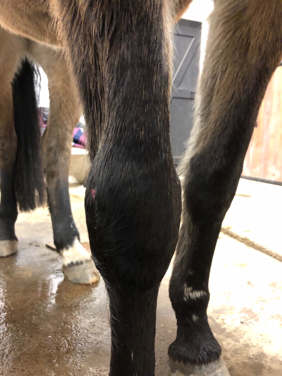 Det är lite större än vad som syns på bilden, men det verkar inte djupt eller störa henne något, lite svullet runt knäet dock. Jag tvättade och spolade rent det med saltlösning, kollade tempen och satte på lite zinkpasta som skyddar lite mot smuts, så får vi se hur det utvecklas. Men hon vilar ju som sagt redan, så av just den anledningen är det ju ganska bra tajmat!