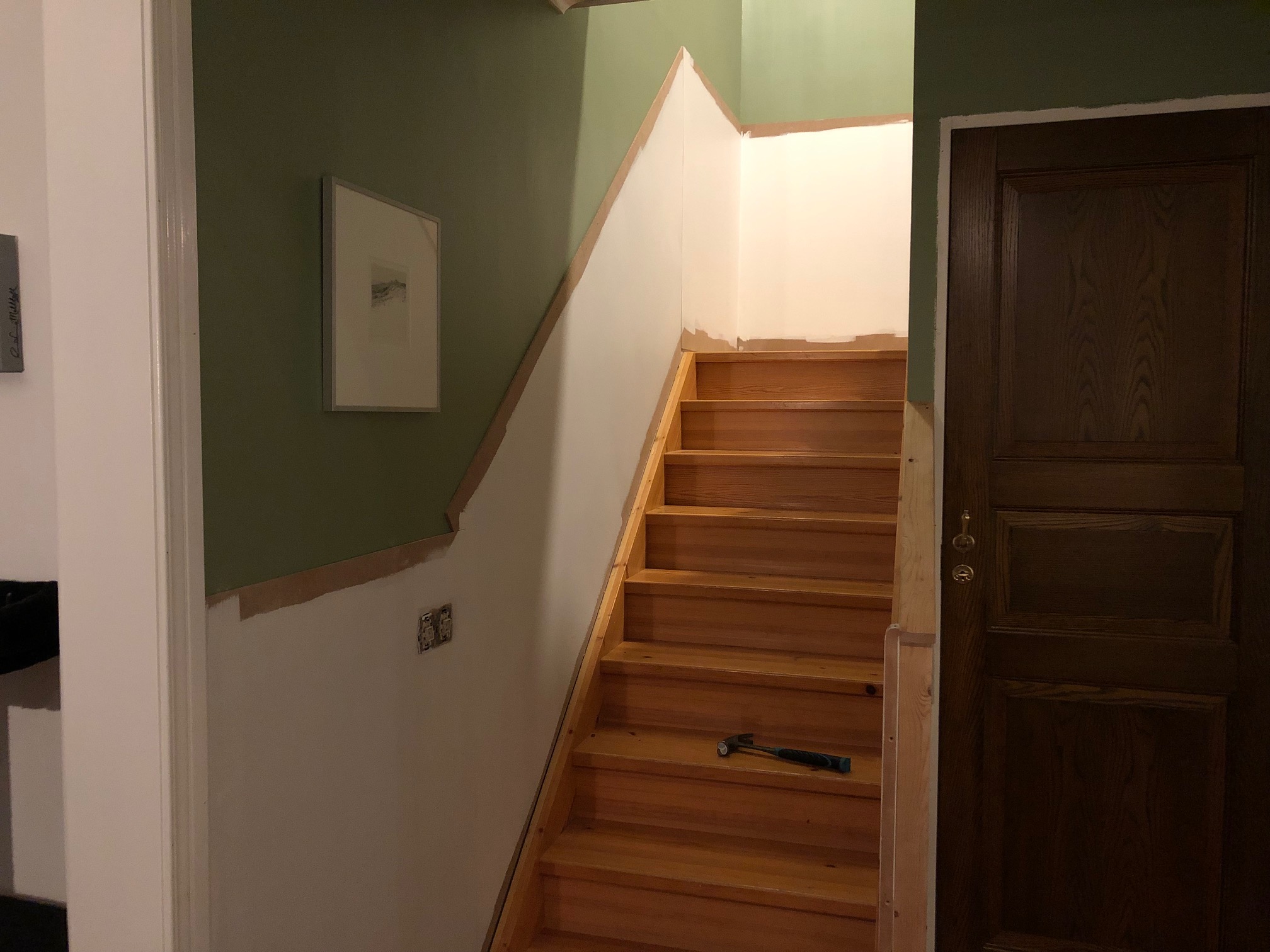 Och jag blev lite extra lycklig senare på kvällen då vi fortsatte med hallen! Vi satte upp de tunna skivorna i trappan, både den som syns på bild här nedan, den lilla triangeln som saknas på bild och så den biten i den övre trappan.