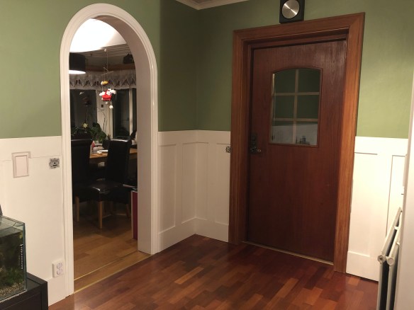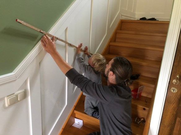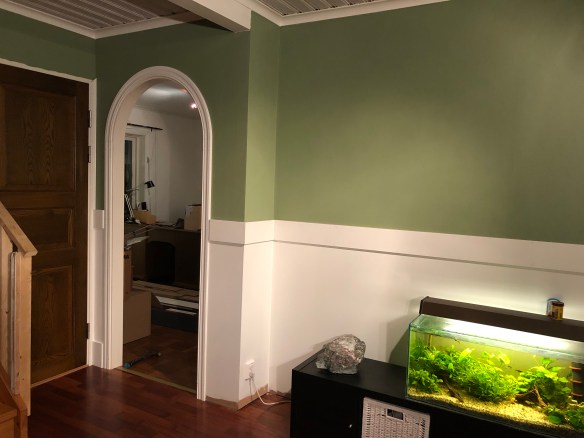 Och det kommer nog bli bra det här! Det ska grundmålas en gång till och sen målas med en lite blankare vit färg (och slipas mellan varje omgång…) och sen ska det på med de tjockare bitarna (som också ska målas) och sen ska allt målas en FJÄRDE gång och till sist nån list upptill och golvlister nertill. Och samma sak i trappan, så det är en del kvar, men det går framåt!
