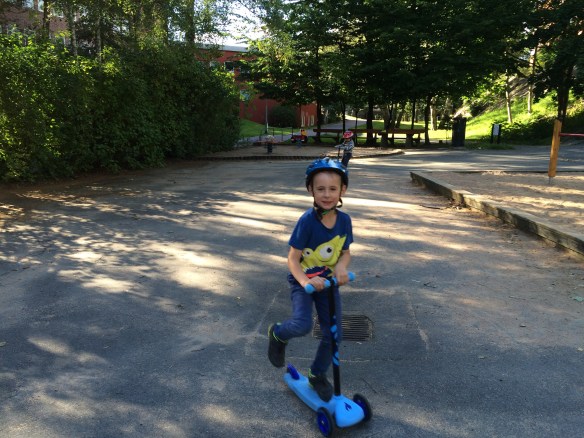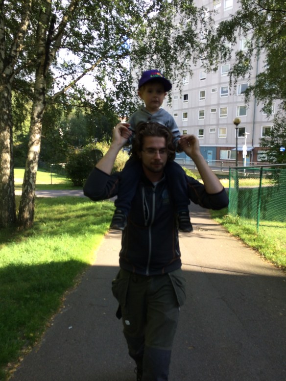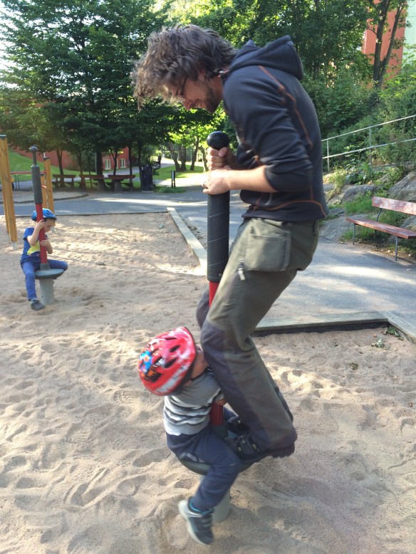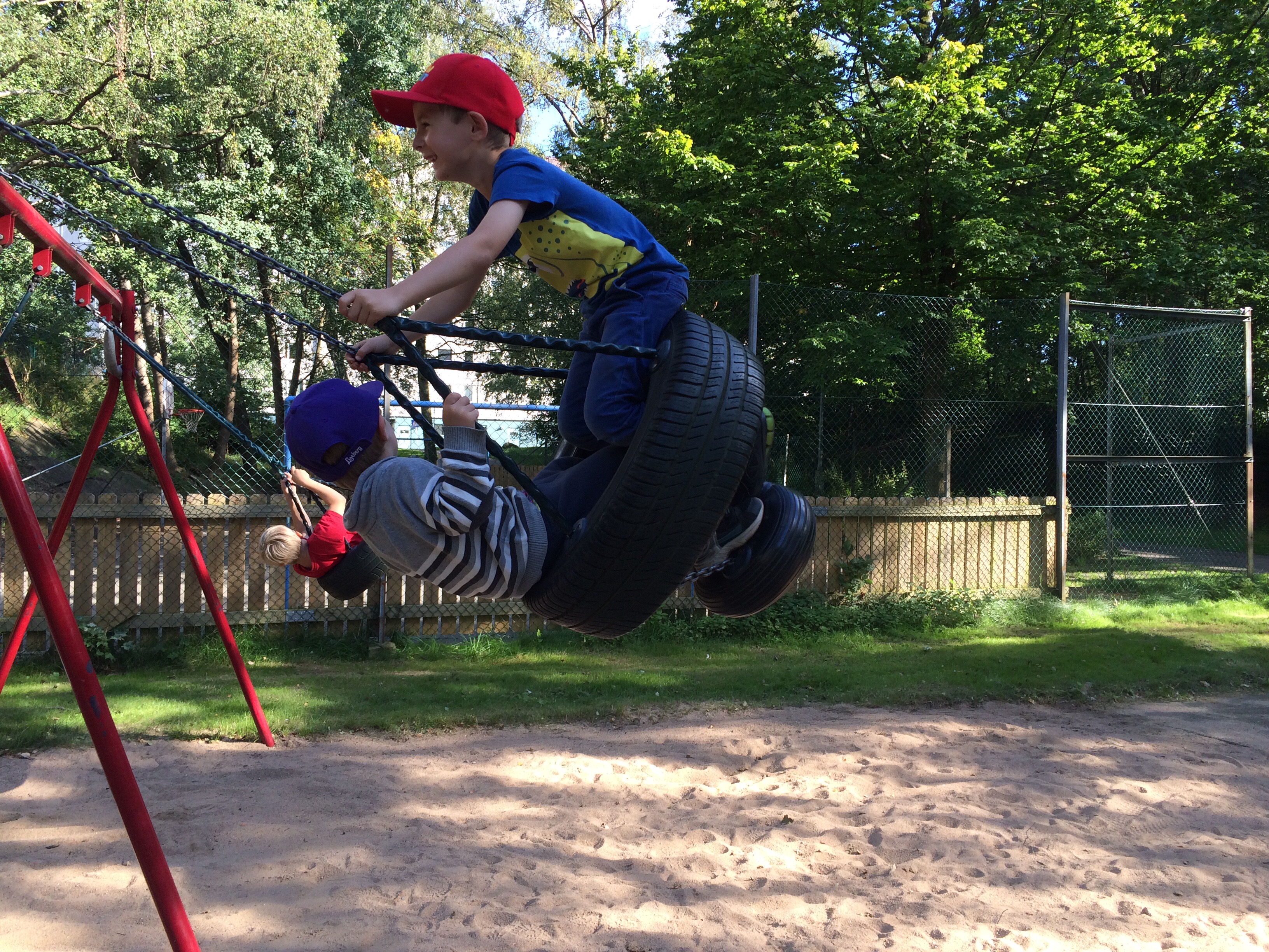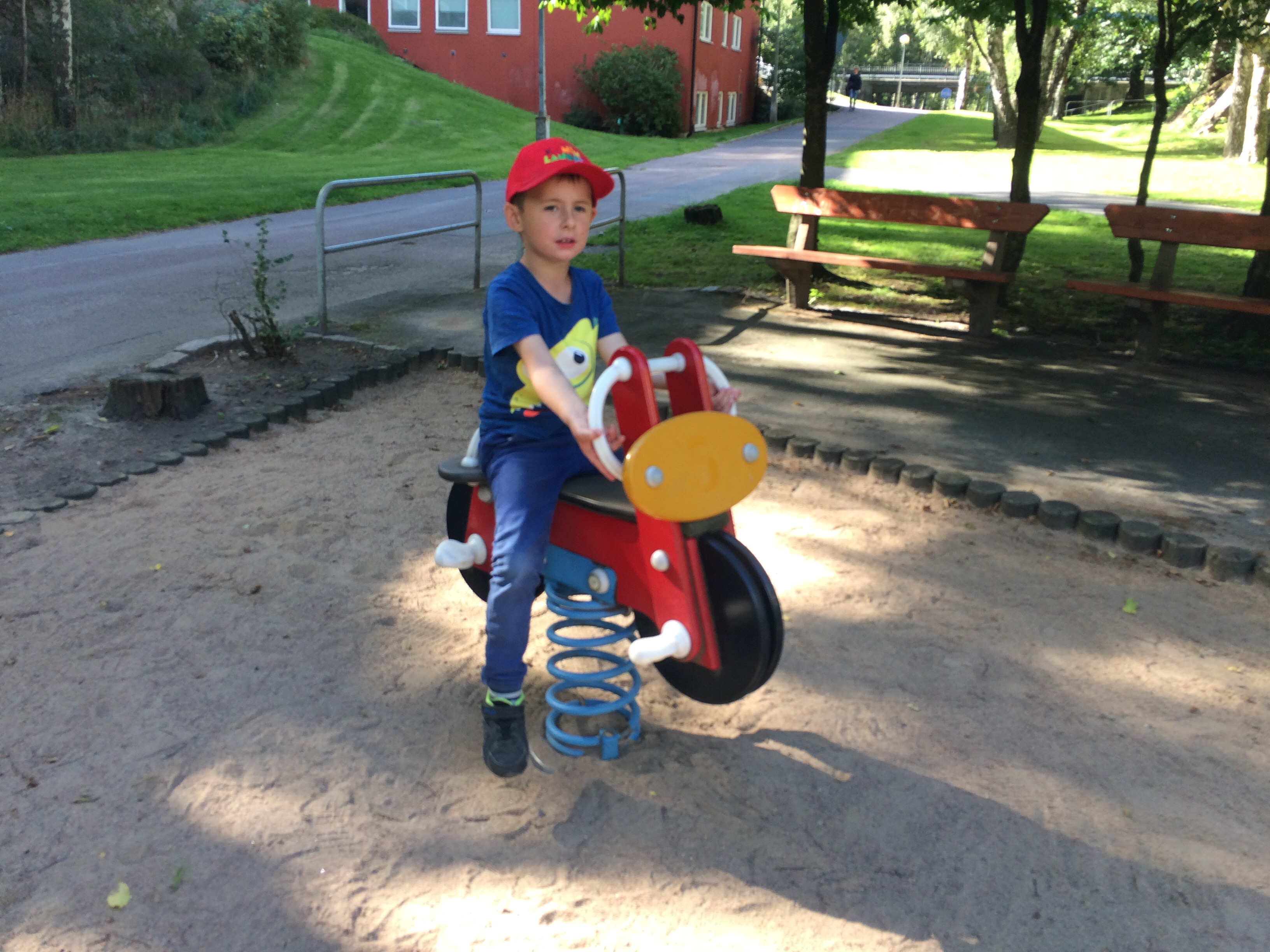 Vi fick med oss barnen utan problem och Lucas visade stolt kuvertet i hans fack där nycklarna till lägenheten fanns. Lägenheten ligger Max två hundra meter från förskolan så pojkarna sprang snabbt i förväg medan jag och Axels spatserade efter. Vi lämnade jackorna i lägenheten och gick ut igen och så gick vi och köpte glass som vi förtärde i den härliga eftermiddagssolen. När allt kladd var upptorkat eller uppätet fick pojkarna välja aktivitet och de ville gå till lekplatsen en bit bort, så det gjorde vi 🙂 Gungor, snurrsaker, sparkcyklar och klättring! Vi var ute hela eftermiddagen och först kvart i sex var vi tillbaka i lägenheten igen. Vi hann med lite lugn lek och var mitt uppe i en älgbok när Susanne kom hem, då fick barnen kvällsmacka och vi fick thaimat! Även Johan hann komma hem innan vi åkte hemåt, radion sattes på och vi lyckades höra när Peder tog sitt välförtjänta OS-silver efter en rafflande omhoppning med sex ryttare. Han och hästen All in har inte rivit ett enda hinder under hela OS, helt fantastiskt!