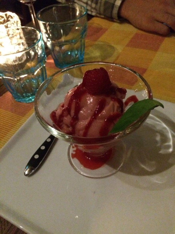 Till middag på Italienska Cyrano i Alingsås, en dryg timme senare, iklädd lite renare och snyggare kläder! Oliver, vitlöksbröd, italiensk pizza och hallonsorbet. Inte alls dumt!
