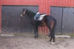 När jag och Linda åkte upp till ridhuset för att koppla på släpet som vi hyrt för kvällens träning fick vi en liten överraskning. Släpet var inte där. Vi åkte ner till stallet men inte heller där stod det något släp. Vi ringde ägaren till släpet som blev lika förvånad som oss och trodde först att släpet blivit stulet. Sedan kom han dock på att hans fru pratat något om att åka iväg med släpet och han ringde till henne – som inte svarade. Hon ringde lyckligtvis upp bara några hjärtslag senare, och visst hade hon släpet och efter en evighetslång väntan (ca 20minuter) rullade släpet in på stallplan och vi kunde snabbt byta bil framför det. Vid det här laget var vi en halvtimme sena ungefär och även om träningstiden hos Sofia inte direkt är skriven i sten så blir man ju stressad, även om man försöker låta bli. Hästarna hade vi redan plockat upp till stallet så Linda satte igång med att göra i ordning släpet och packa alla grejer medan jag borstade Kaprifol. Hon var ren som tur var!